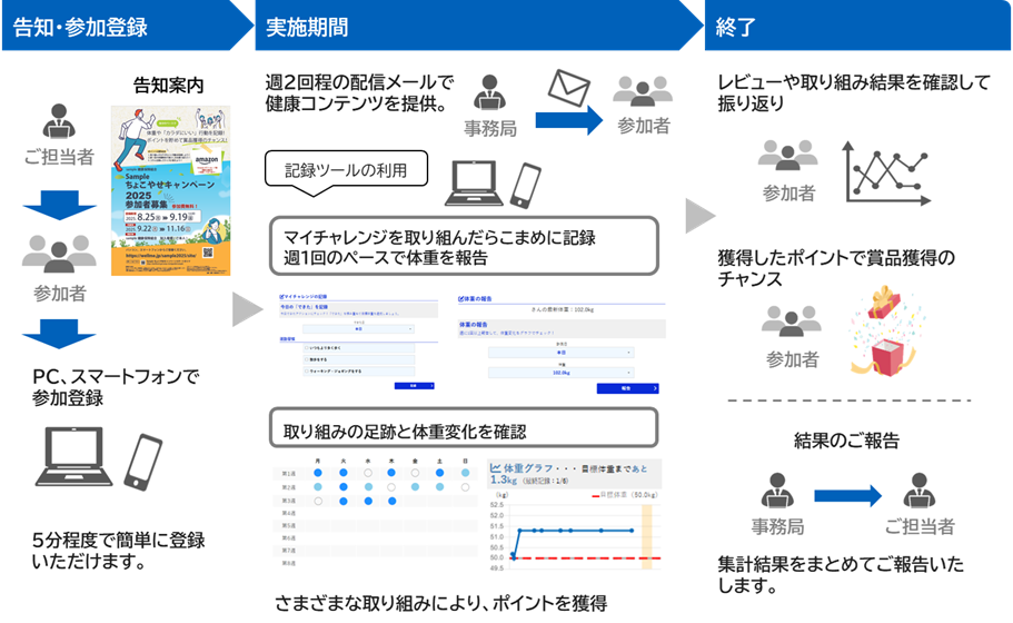 また、開催枠組み・進行管理はキャンペーン事務局が主導するので、保健事業担当者様の企画準備や事務負担は最小限に抑えられます。